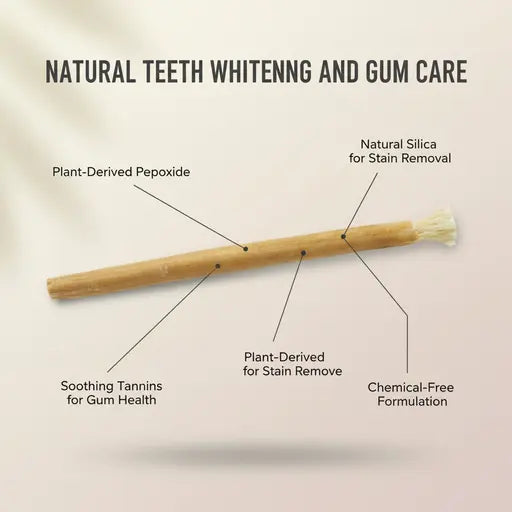 Our product is made from 100% natural Miswak, a traditional teeth cleaning tool. It contains powerful antibacterial properties and natural abrasives that help stain removal without harsh chemicals, ensuring a safe and effective whitening experience.